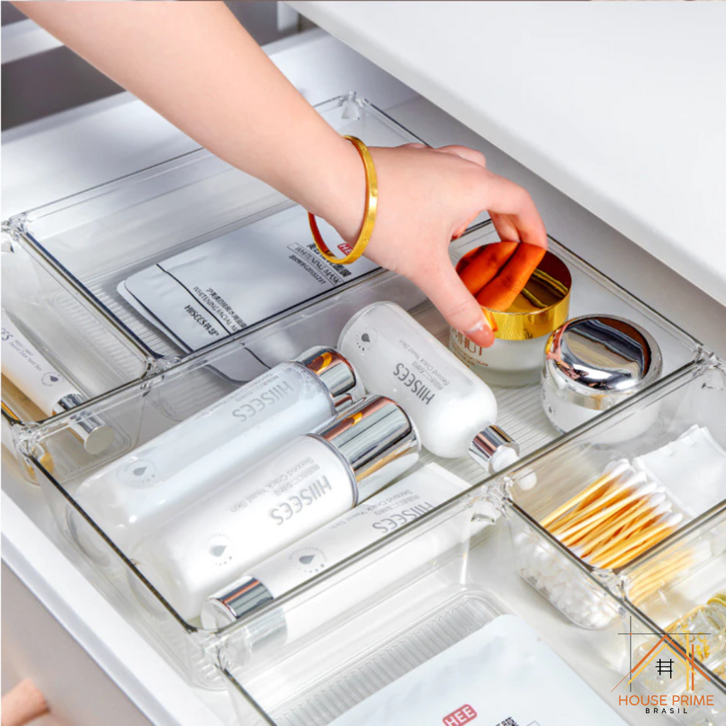 O Kit com 16 ou 25 Organizadores Multiuso Modulares em Acrílico Cristal é a solução definitiva para quem deseja manter cada item no lugar com sofisticação. Feito em acrílico transparente de alta qualidade, esse conjunto garante visual limpo, moderno e versátil, perfeito para qualquer tipo de gaveta ou superfície.